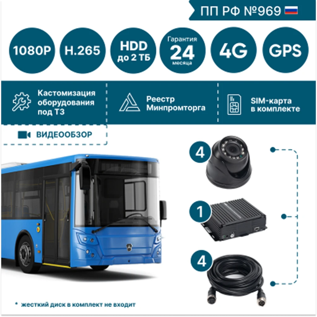 Комплект видеонаблюдения на 4 камеры NSCAR BUS401 FullHD_HDD с опциями 4G+GPS/Глонасс